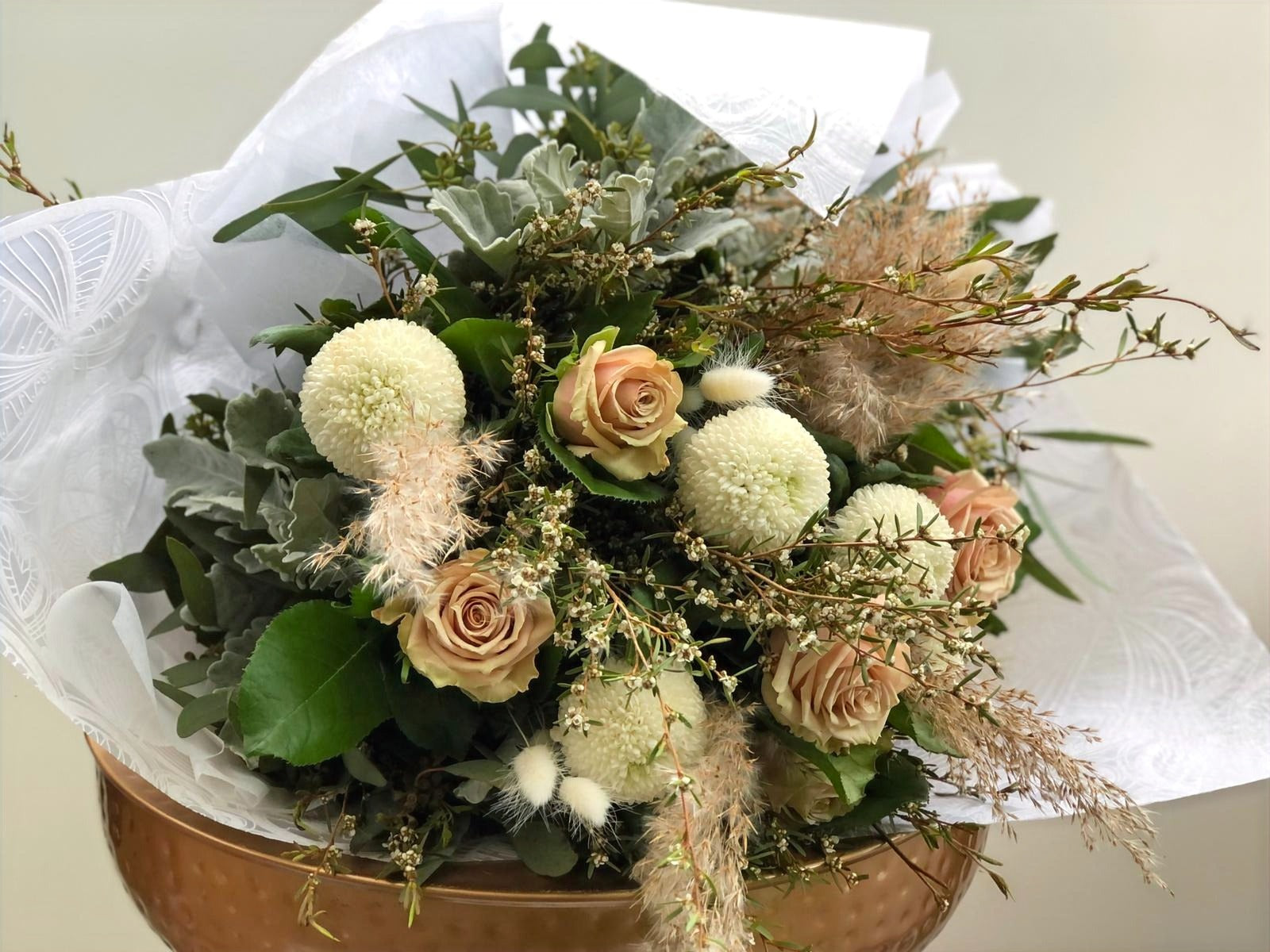 Rustic coloured roses, cutest ping pong chrysanthemums, bunnies tails, silver suede & magnolia finished with brown feathery textured reeds.
